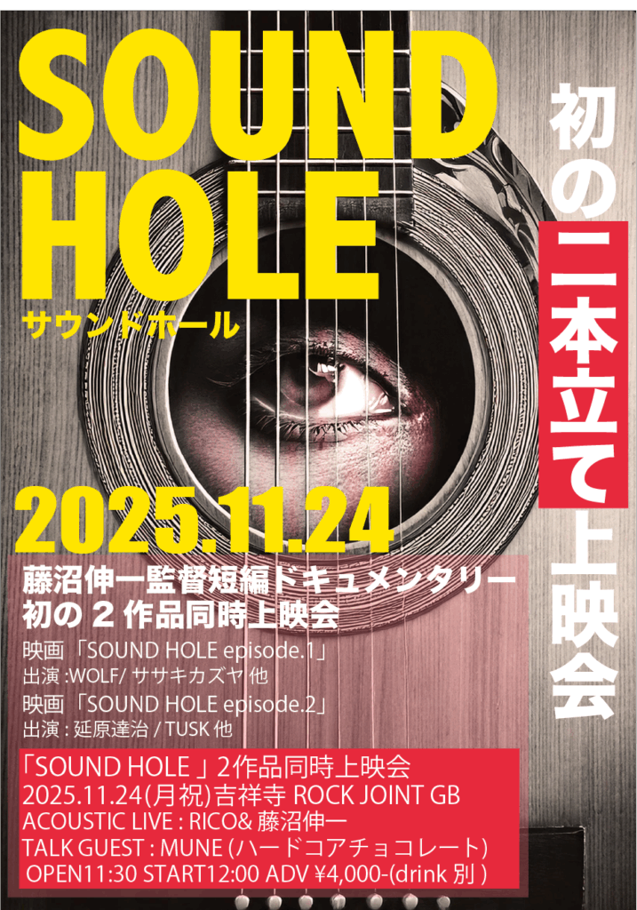 11/24に吉祥寺ROCK JOINT GBにて開催する「SOUND HOLE 2作品同時上映会」のトークゲストとして、アパレル・ブランド「ハードコアチョコレート」からMUNE氏の参加が決定!アパレル界の悪童として絶大な人気を誇る「コアチョコ」の代表であり、映画・プロレス・音楽・アニメ等を独自のセンスで世に打ち出し続けるMUNE氏と藤沼伸一によるトークは必見だ!